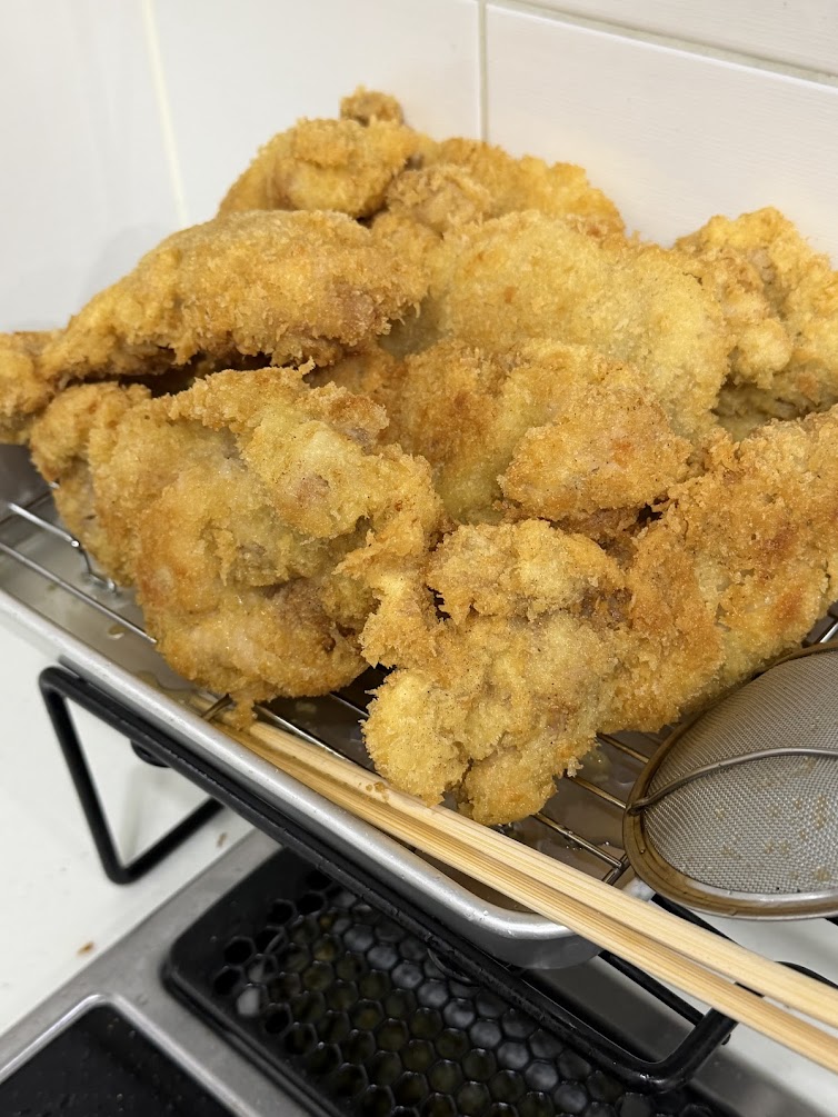 チキンはドカンっと8枚くらい盛り合せたら、高校生ガンガン食べてくれる。特に野球部男子、ご飯大盛りx②杯。豚汁大盛りx②杯。チキンカツプライスレス。