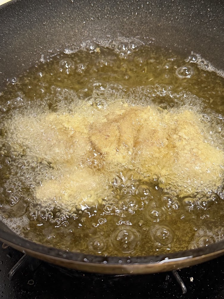 ただマサ・ザ・シェフのこだわりは、通常「小麦粉→溶き卵→パン粉」のところを、「天ぷらバター(てんぷら粉を水で溶いたもの)→パン粉」です。